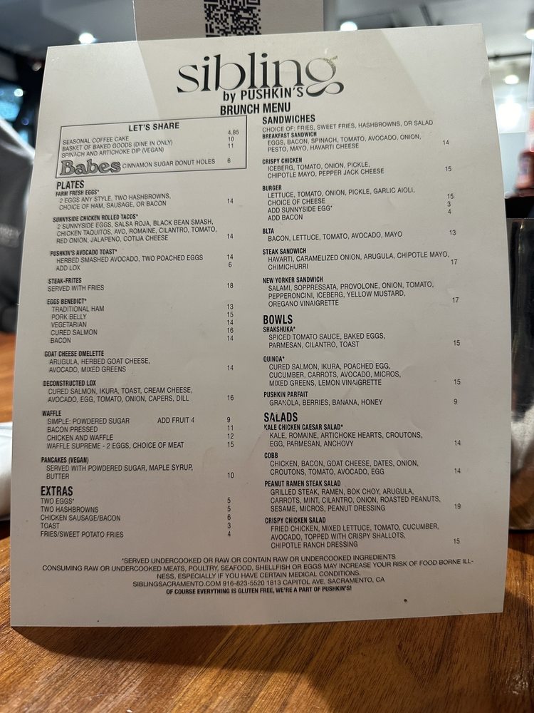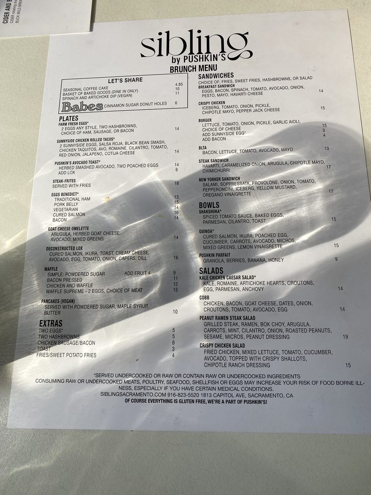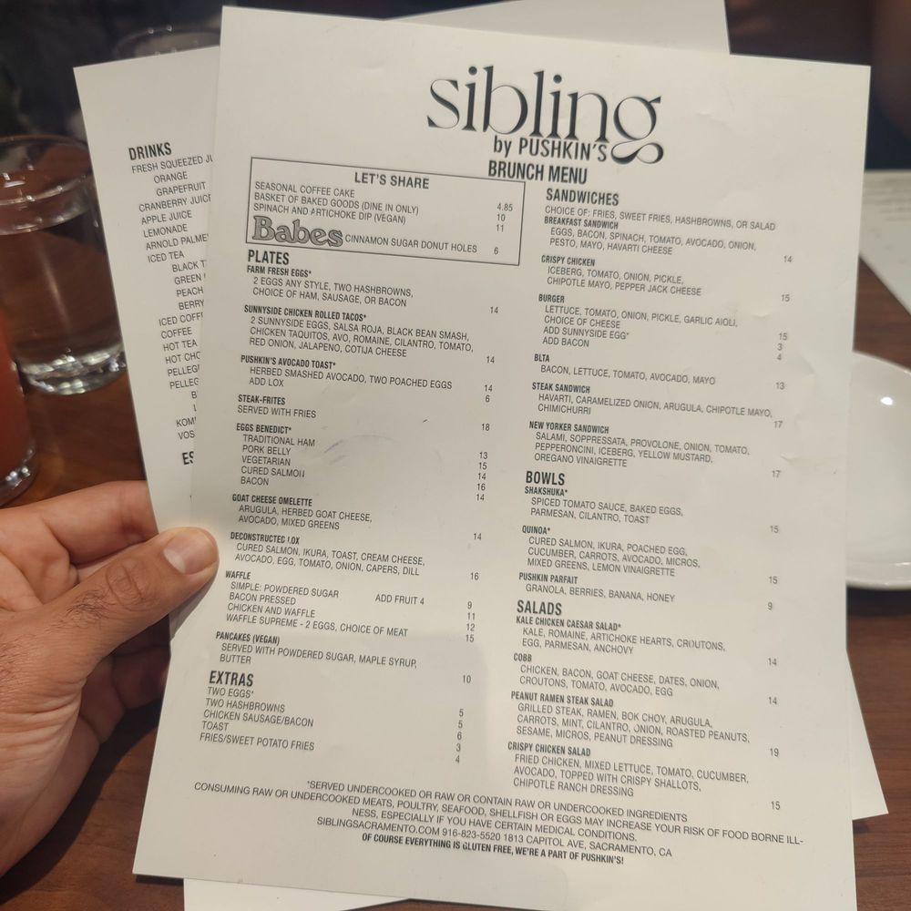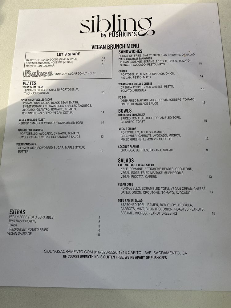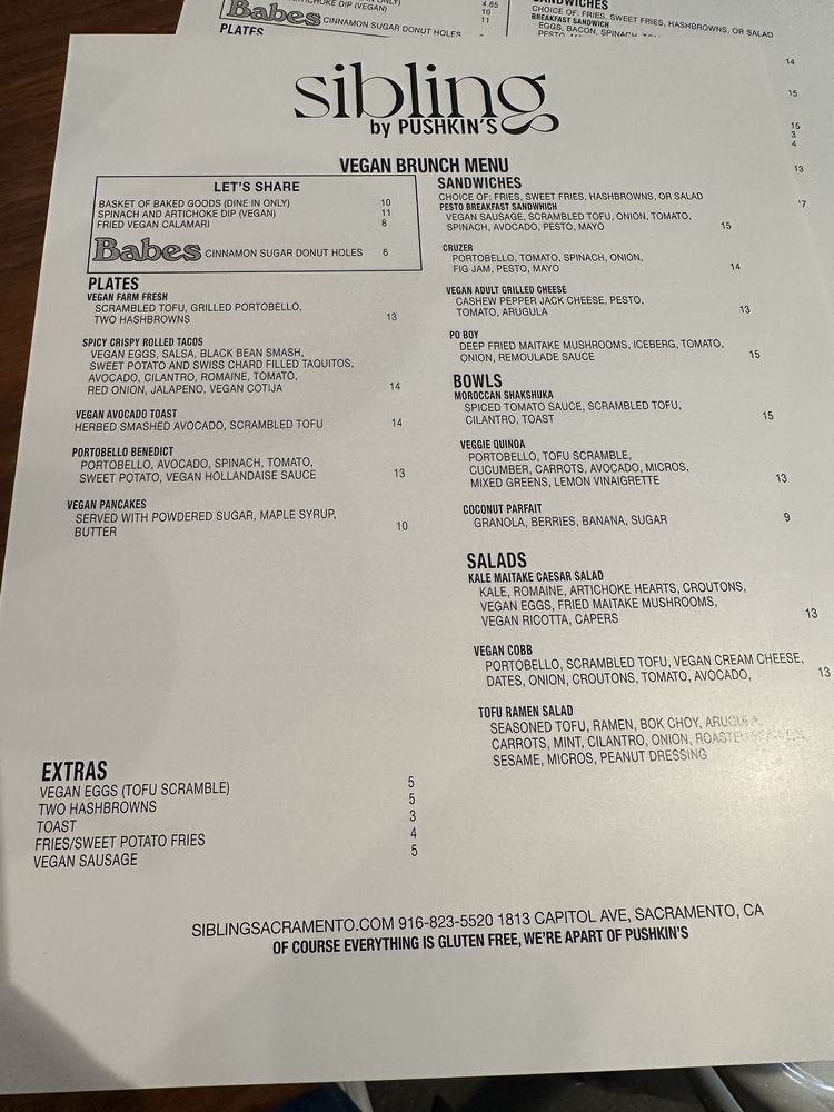 Sibling by Pushkin’s is a trendy and inclusive eatery in Sacramento, offering a diverse menu catering to both vegan and non-vegan diners. Customers rave about the delicious vegan breakfast tacos, deconstructed lox, Pushkin parfait, omelette, crispy chicken sando, and vegan taquitos. The extensive vegan menu includes options like the vegan dinner menu with tantalizing dishes like lasagna. The atmosphere is described as inviting, with ample seating indoors and out, perfect for enjoying dishes like the juicy fried chicken sandwich made with gluten-free bread. The service receives high praise, with friendly and attentive staff like server Jake and host Katie providing top-notch experiences. Sibling by Pushkin’s truly stands out for its farm-to-folk approach, offering fresh ingredients and seasonal vegan options in a family-friendly setting.